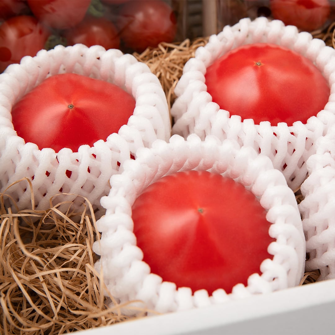 石山さんちのフルーツトマトも、できるだけよい状態でお届けできるよう、傷みやつぶれに配慮しながら丁寧に箱詰めしてお送りします。お手元に届いた際に、見た目にも気持ちよく、安心してお召し上がりいただけるよう心がけております。ご家庭用としてはもちろん、ちょっとした贈りものにもお選びいただきやすいよう、丁寧にお包みして発送いたします。